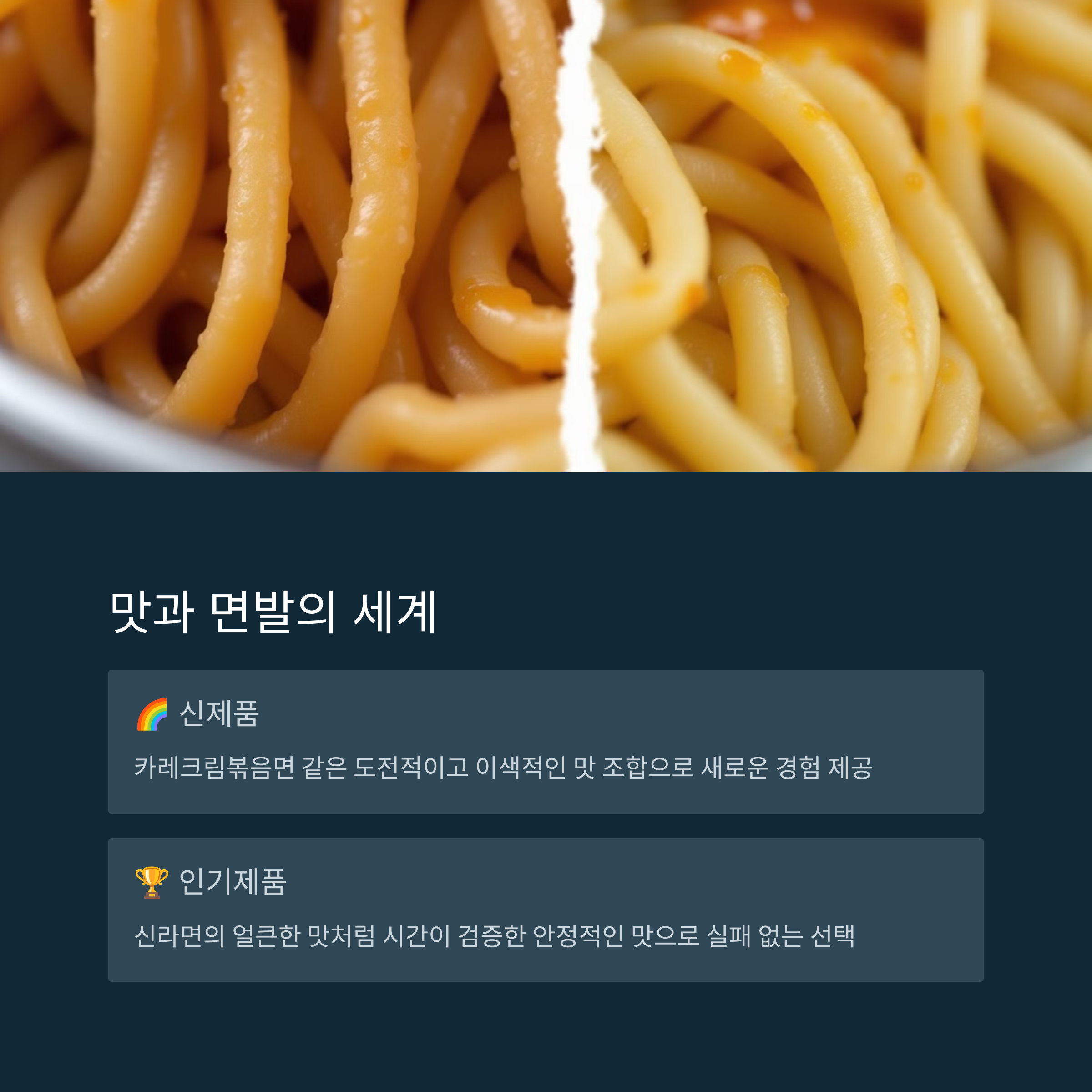 신제품은 확실히 실험적인 맛이 많아요. 기존에 없던 퓨전 스타일, 예를 들어 '마라 크림라면' 같은 혼종이 등장하고 있죠. 반면 인기제품은 검증된 맛, 즉 국물맛이 깊고 익숙한 조합이 특징이에요. 어떤 날은 도전적인 맛이 땡기지만, 솔직히 말해 퇴근 후 배고플 때는 익숙한 맛이 최고더라고요. 신제품은 재밌고 자극적이지만, 인기제품은 편안하고 안정감 있는 느낌? 딱 그 차이였어요.