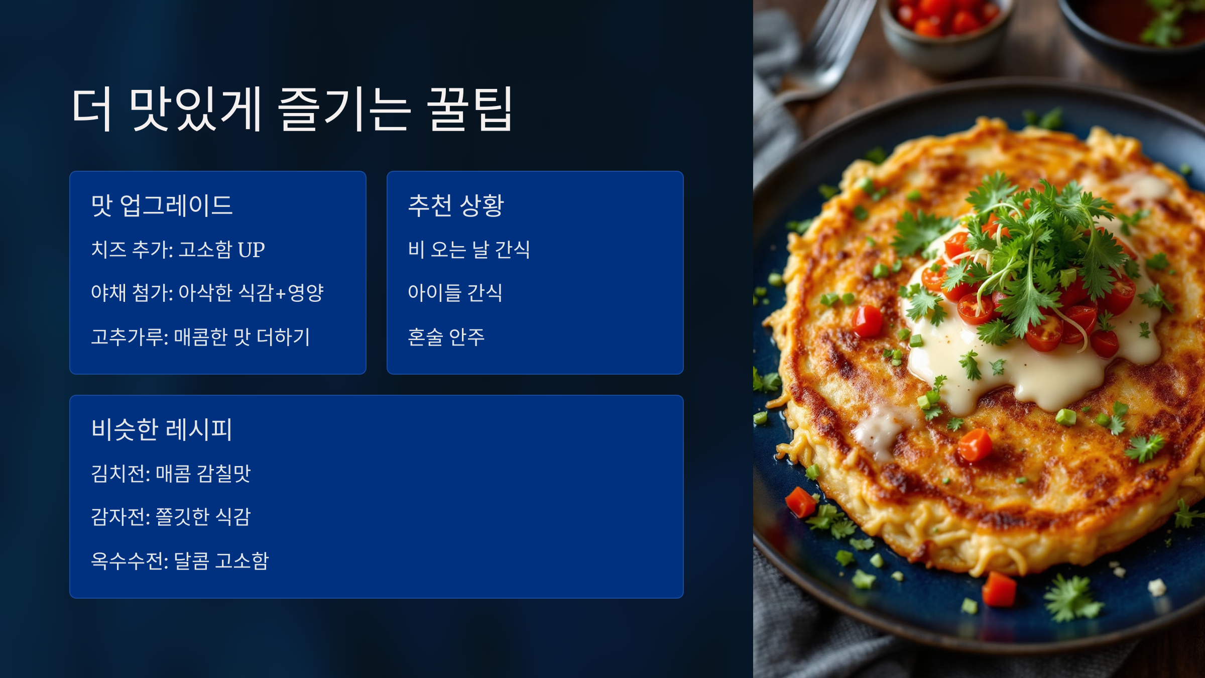 라면 전을 더욱 맛있고 특별하게 만들고 싶다면, 아래의 팁을 참고해 보세요. 약간의 변화로 완전히 새로운 맛을 경험할 수 있습니다.